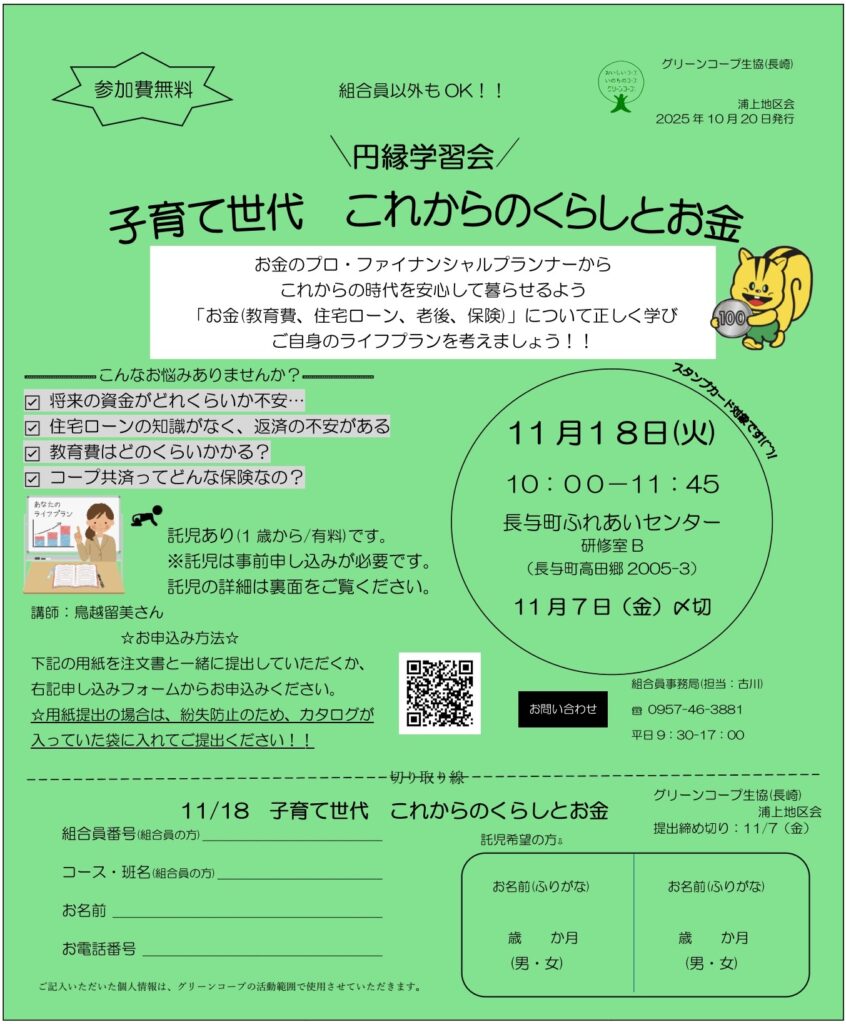 今回、浦上地区で主催する円縁学習会のテーマは「子育て世代 これからのくらしとお金」です。